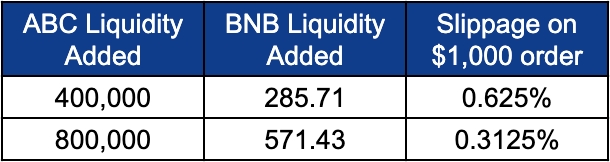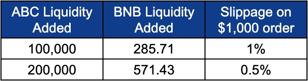 Currently, deep pockets are required to build liquidity in popular AMMs like Uniswap and Pancakeswap that require a 50:50 ratio be maintained in the swap pair. The table below illustrates the corresponding liquidity and slippage for entering a constant-product 50/50 AMM. For instance, a team created token ABC with the initial price of $1 and the price of BNB is $350.